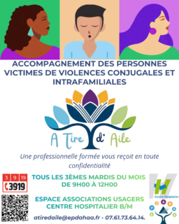 L’association A tire d’Aile propose un accompagnement aux personnes victimes de violences conjugales et intrafamiliales par une professionnelle formée et en toute confidentialité.