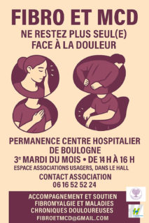 Permanence au niveau de l’Espace Associations Usagers (hall d’accueil au rez-de-chaussée du CHB) le : 3e mardi du mois de 14h à 16h : accompagnement et soutien pour la fibromyalgie et les maladies chroniques douloureuses.