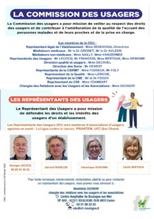 Cette commission a pour objet de garantir les droits des patients, de les écouter et de les accompagner, d’améliorer la qualité et la sécurité des soins et d’informer sur les coûts et les remboursements. La liste des membres de cette commission est disponible à l’accueil.