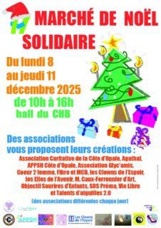 Un Marché de Noël solidaire vous est proposé dans le hall du Centre Hospitalier de Boulogne-sur-Mer du lundi 8 au jeudi 11 décembre 2025 de 10h à 16h.