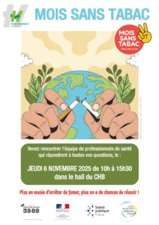 Dans le cadre du « MOIS SANS TABAC » : une équipe de professionnels du service Addictologie sera présente dans le hall du Centre Hospitalier de Boulogne-sur-Mer pour répondre à toutes vos questions, le :