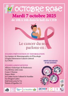 Dans le cadre d’Octobre rose, une journée de sensibilisation est organisée le MARDI 7 OCTOBRE 2025 de 10h à 16h dans le hall du CHB.