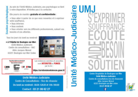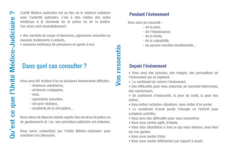 Les victimes d’agression sont admises à l’Unité Médico-Judiciaire où elles bénéficient d’une prise en charge spécifique de soins et d’un soutien psychologique.