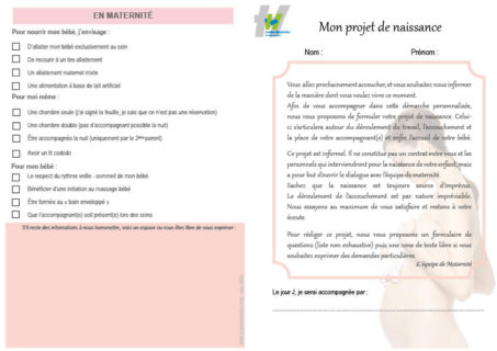 Ce projet est informel. Il ne constitue pas un contrat entre vous et les personnels qui interviendront pour la naissance de votre enfant, mais a pour but d’ouvrir le dialogue avec l’équipe de maternité.