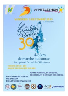 • avec une arrivée en Mairie de Boulogne-sur-Mer pour le traditionnel vin chaud vers 19h30-20h avec résultats de défi vélo Téléthon au CHB